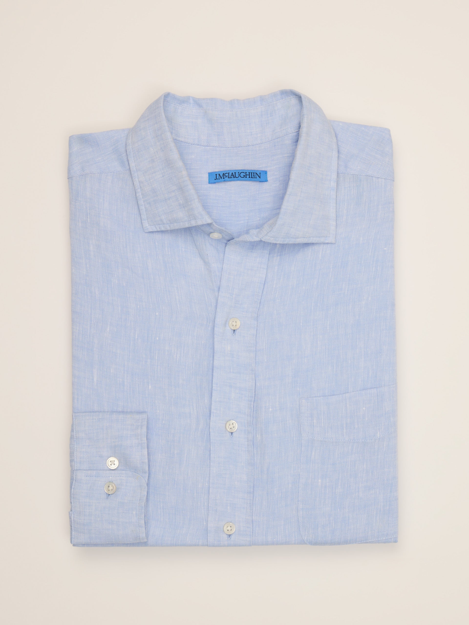 Mens Long sleeve Soft point collar Front pocket Classic fit 100% Linen Machine wash cold. Lay flat to dry. Imported. Size & Fit Classic fit 31″ long from top of center back