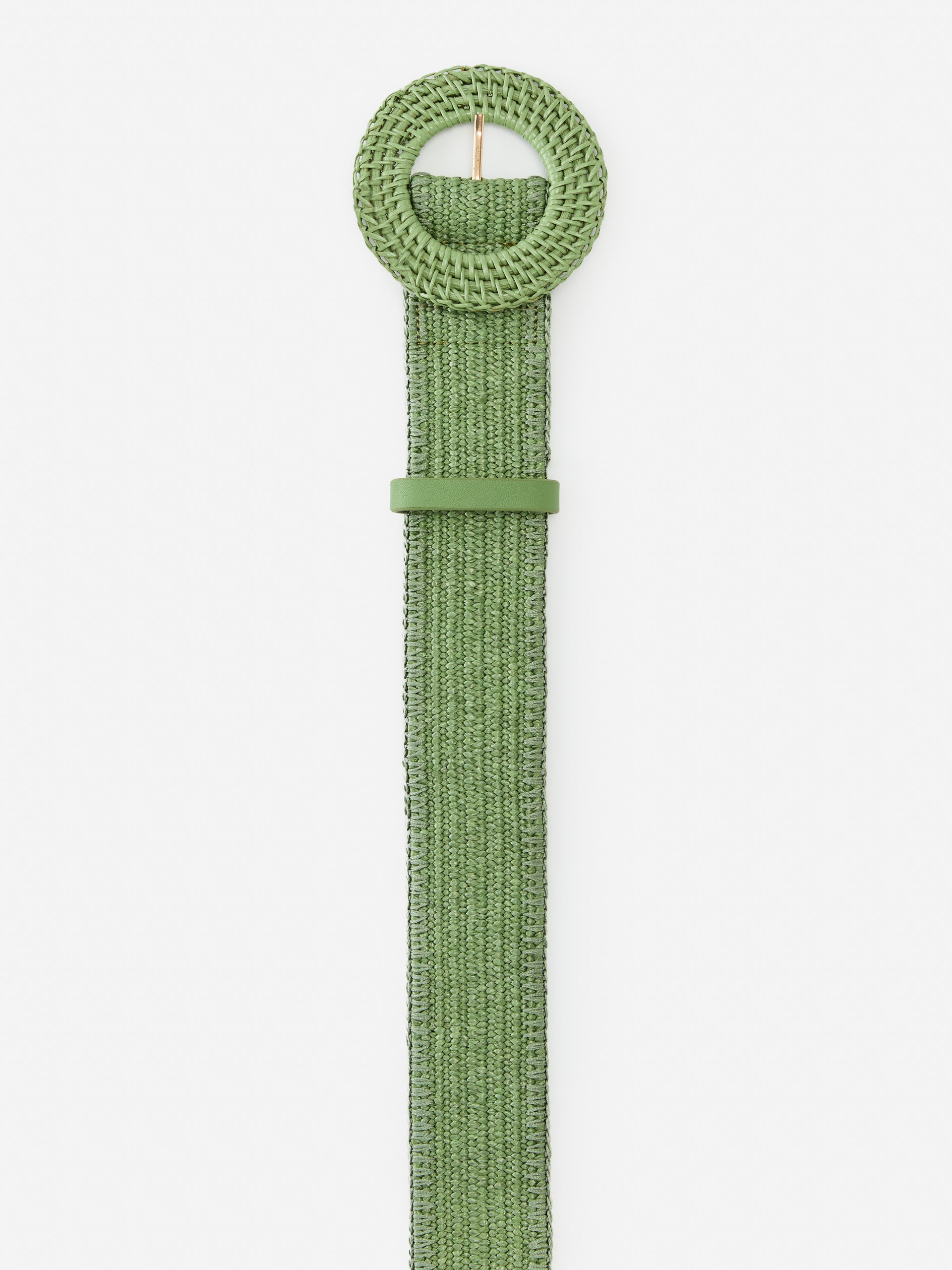 Elastic grasscloth belt Rattan buckle 100% Polypropylene Imported Size & FitIf you intend to wear lower than your natural waist, we suggest sizing up 2″ Width Size XS/S: 35″ L, M/L: 37″ L