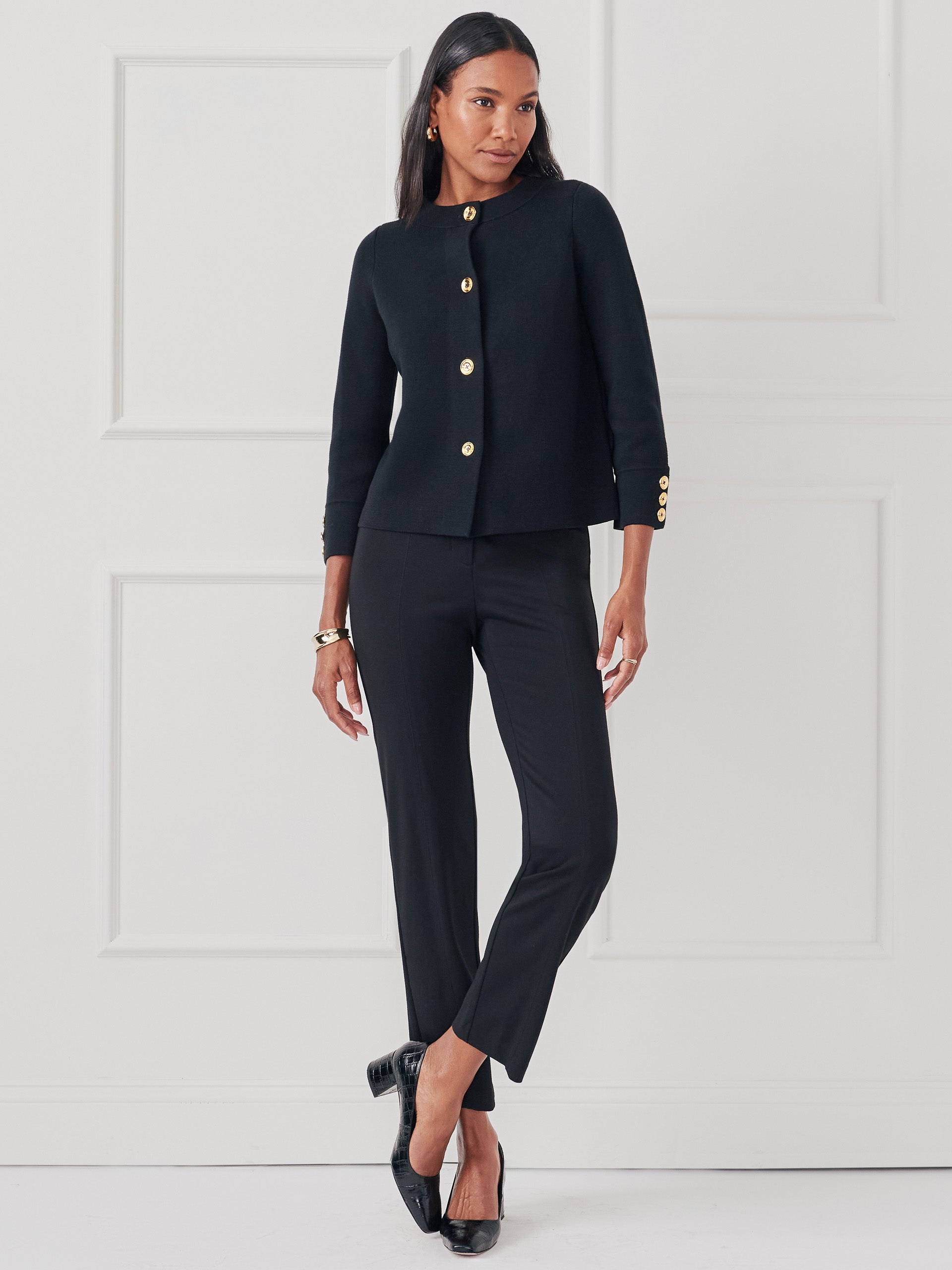 3/4 sleeves Mock neck Button front 3-button cuffs Slightly cropped length 66% Cotton, 34% Modal Dry clean only. Imported. Size & Fit19 1/2″ long from top of center back (size M) Model is 5’9″ and wearing a size XS.